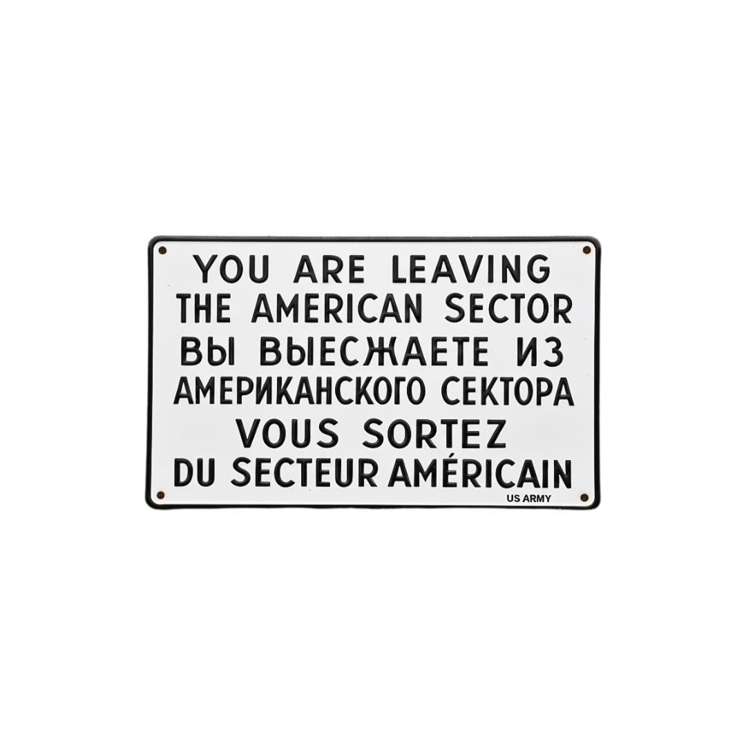 After WWII, Berlin was split into four occupation sectors. At the boundaries—especially at Friedrichstraße/Checkpoint Charlie—the U.S. Army posted large multilingual boards reading “YOU ARE LEAVING THE AMERICAN SECTOR.” Originals were big painted boards or sheet-metal panels mounted roadside. This plaque scales that design to a displayable size while preserving the stark, utilitarian style that defined the era.