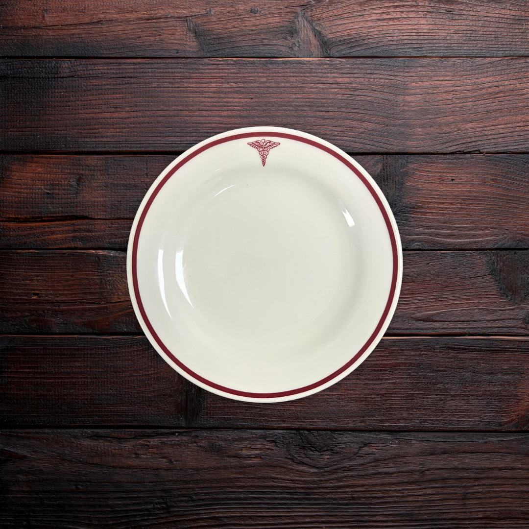 A classic piece of American restaurant ware: heavy, chip-resistant Homer Laughlin China plate featuring a medical caduceus crest and red band on warm ivory glaze. Built for hospital service; handsome enough for display.